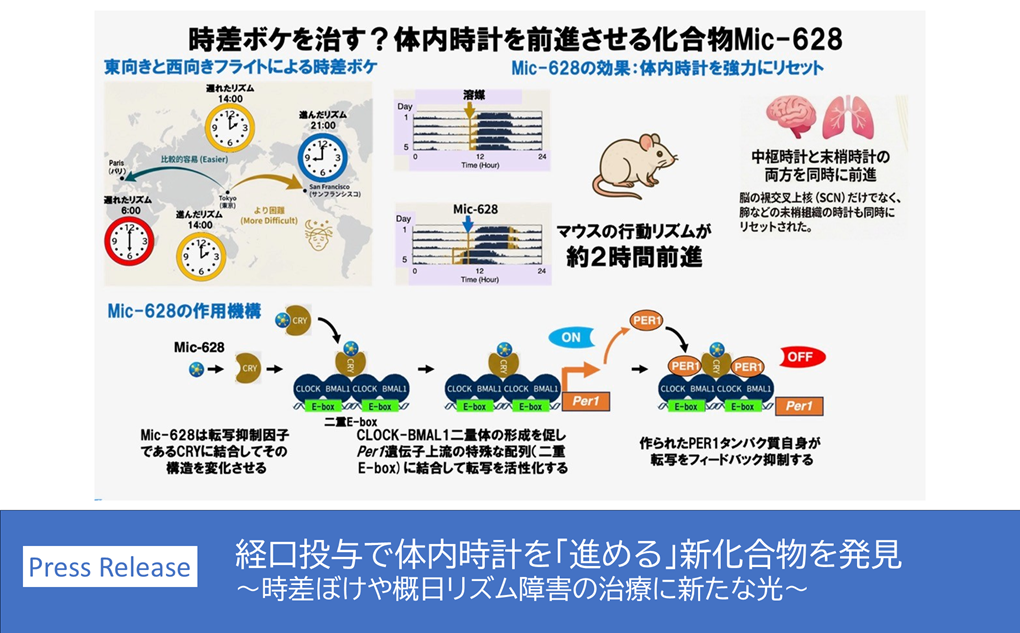 #研究成果 2026.01.26 経口投与で体内時計を「進める」新化合物を発見 「朝起きるのがつらい」「海外旅行の時差ぼけを早く治したい」——そんな願いを叶える鍵は、私たちの細胞にある『時計遺伝子』が握っています。ゲノム編集技術開発ユニットの高畑佳史准教授、金沢大学の程肇名誉教授…… 詳しくみる