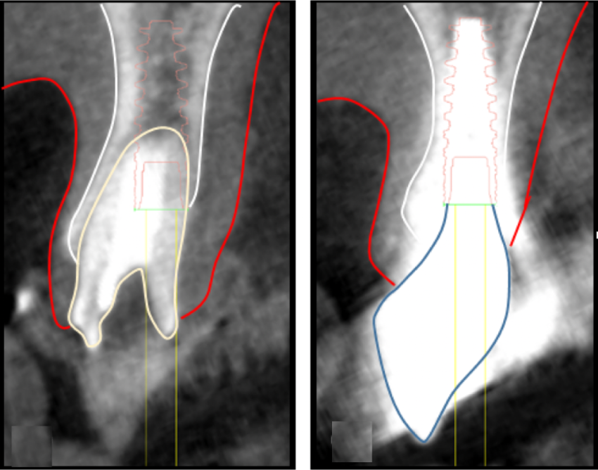 前歯部審美領域への即時埋入インプラント(抜歯前および上部構造装着1年後のCBCT画像)